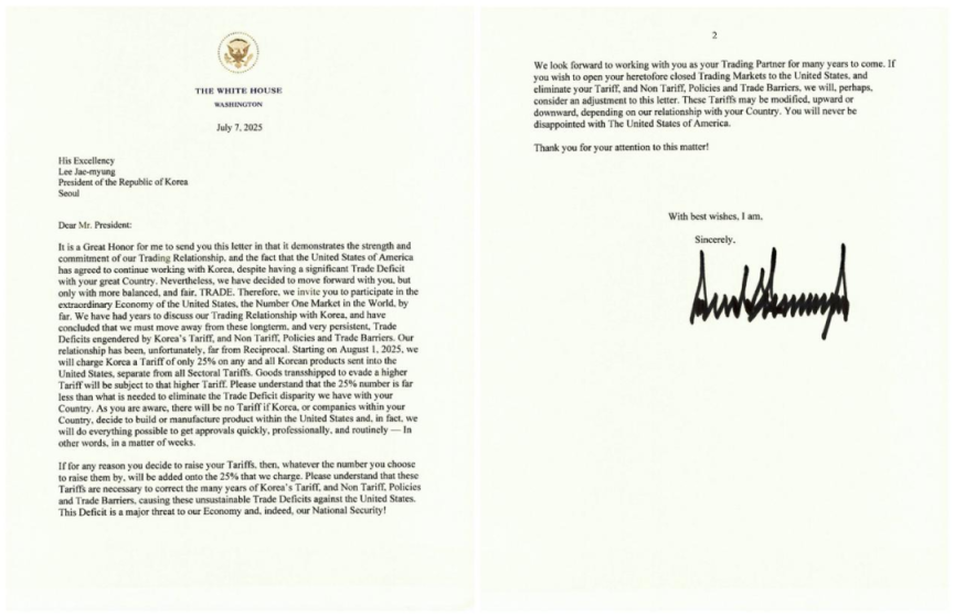 特朗普在社交媒体帖子中分享了致韩国领导人规定新关税税率的信函截图。制图:管娜
