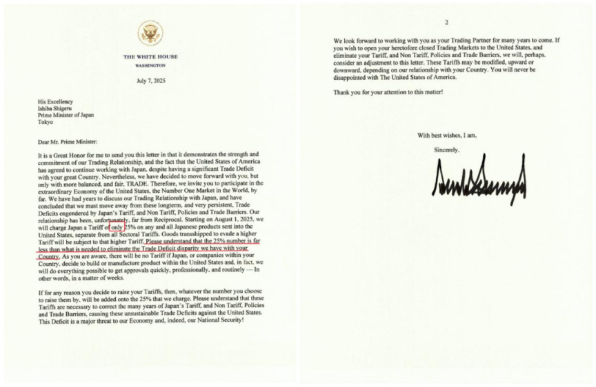 在信中,特朗普说,从8月1日起,将对来自日本和韩国的进口产品“仅征收”25%的关税。