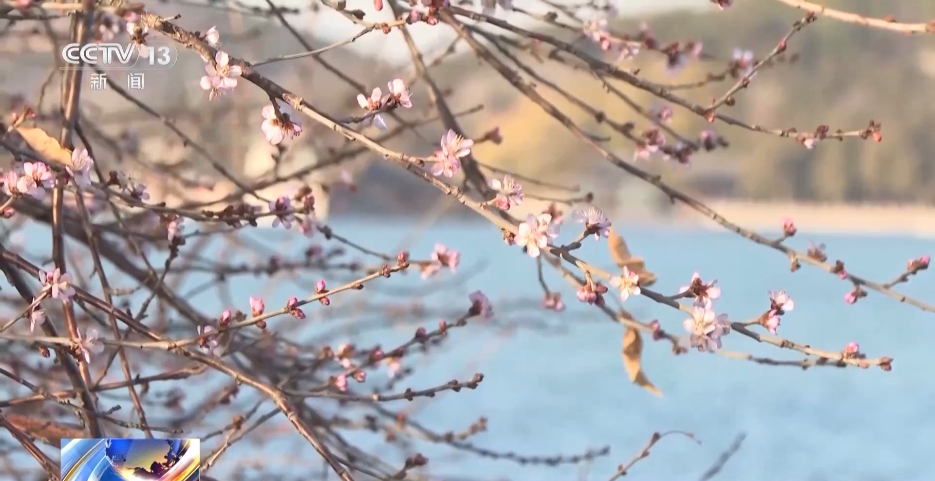 总台记者 邵薇:在这样的天气下站一会儿,我的手已经冻红了。可是我身后西堤岸边有一株原本在三月花期的山桃提前开花了。粉红的山桃,黄绿的垂柳,在这个冬天相映成趣。也正是因为这颗山桃垂向湖面的这种形态,不同的角度可以和远处的万寿山以及十七孔桥同框,才引来了这么多游客打卡。